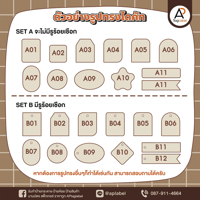 ให้บริการออกแบบป้ายแท็ก ไดคัทตามรูปทรง สามารถเจาะรูร้อยเชือกได้ ใส่ใจในทุกขั้นตอน หากต้องการรูปทรงอื่นๆ ก็สามารถทำได้เช่นเดียวกัน สามารถสอบถามได้ครับ